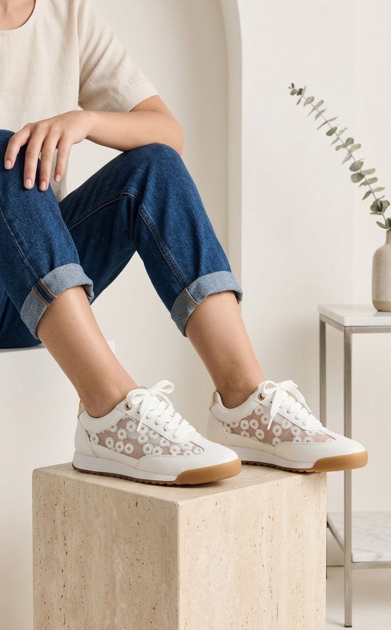 Combina comodidad y estilo con estos sneakers de silueta clásica. Su diseño en tonos neutros con detalles metalizados y pasteles los hace perfectos para elevar cualquier look diario, desde jeans hasta faldas hermosas.
